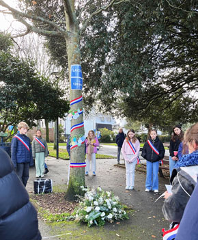 Ce samedi 6 décembre, les nuages se sont écartés, le temps de se rassembler et de déposer une gerbe au pied de l’arbre de la laïcité.