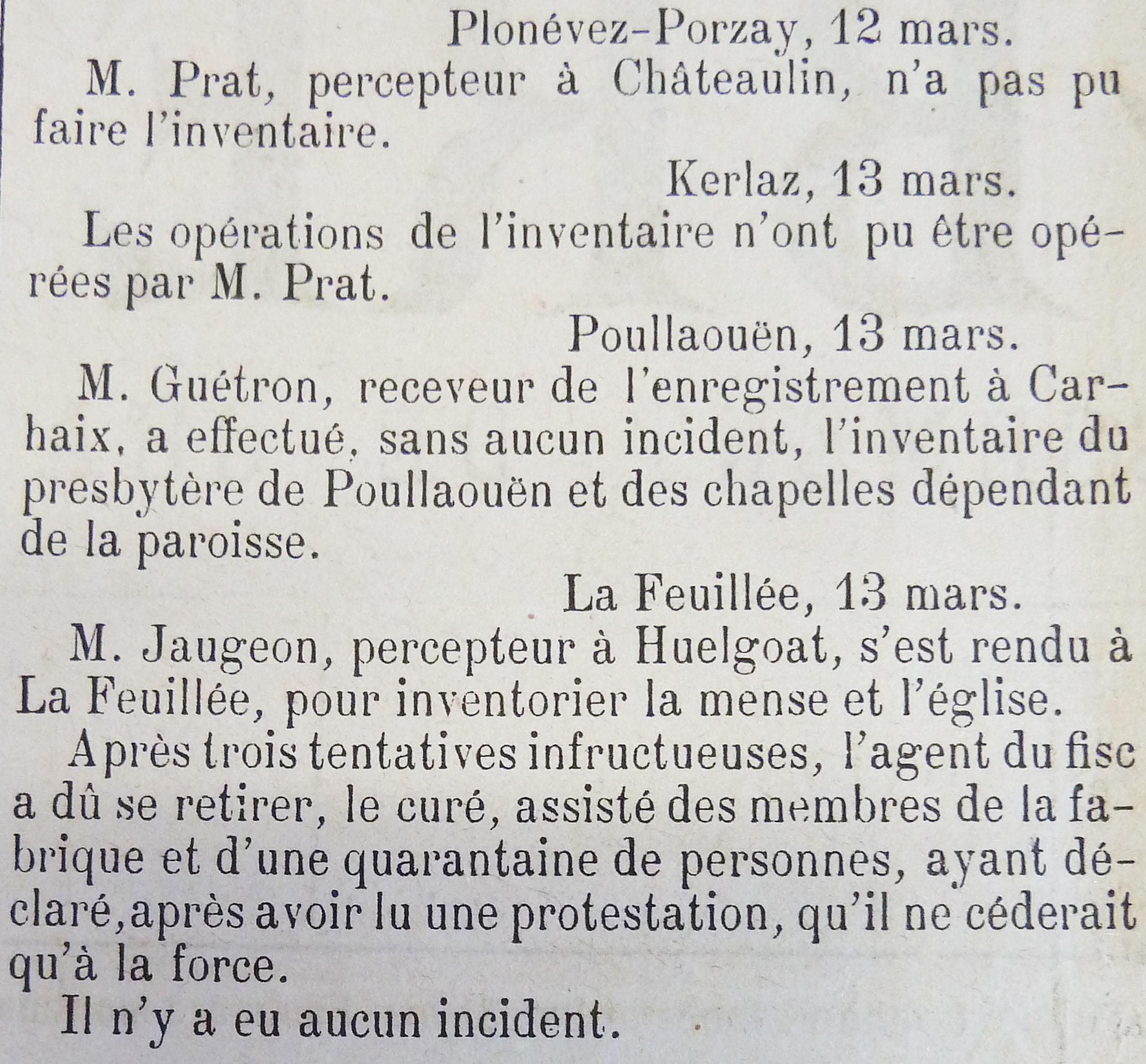 La Feuillée : le curé, assisté de membres de la fabrique et d’une quarantaine de personnes ont résisté : « nous « ne céderons qu’à la force ». Le percepteur d’Huelgoat s’est retiré. Pas d’incident.