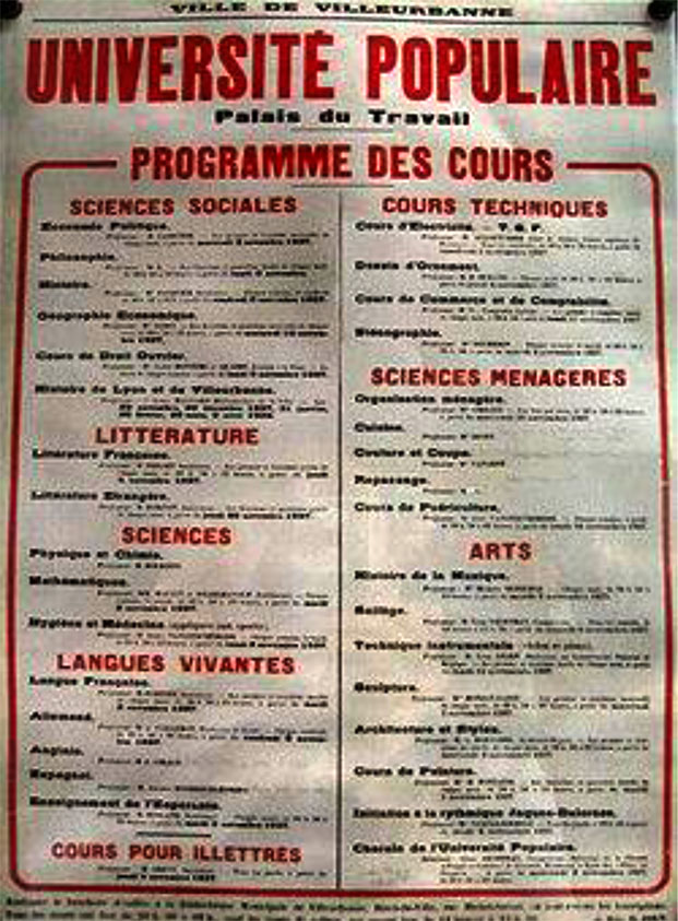 1899 : Georges Deherme, un ouvrier sculpteur sur bois et typographe, fonde les universités populaires : il prône un partage des savoirs fondé sur des valeurs :