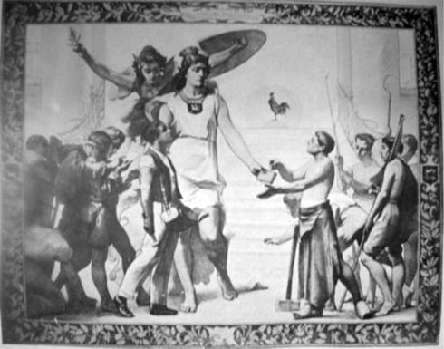 Les symboles : la République offrant des livres, symboles des savoirs, à des adolescents tout juste sortis de l’école primaire : des artisans, ouvriers et paysans qui portent fièrement les outils de leur état, mais se jettent avidement sur la culture qui leur est, même après l’école obligatoire, généreusement distribuée. Au fond, le coq dans le soleil levant.